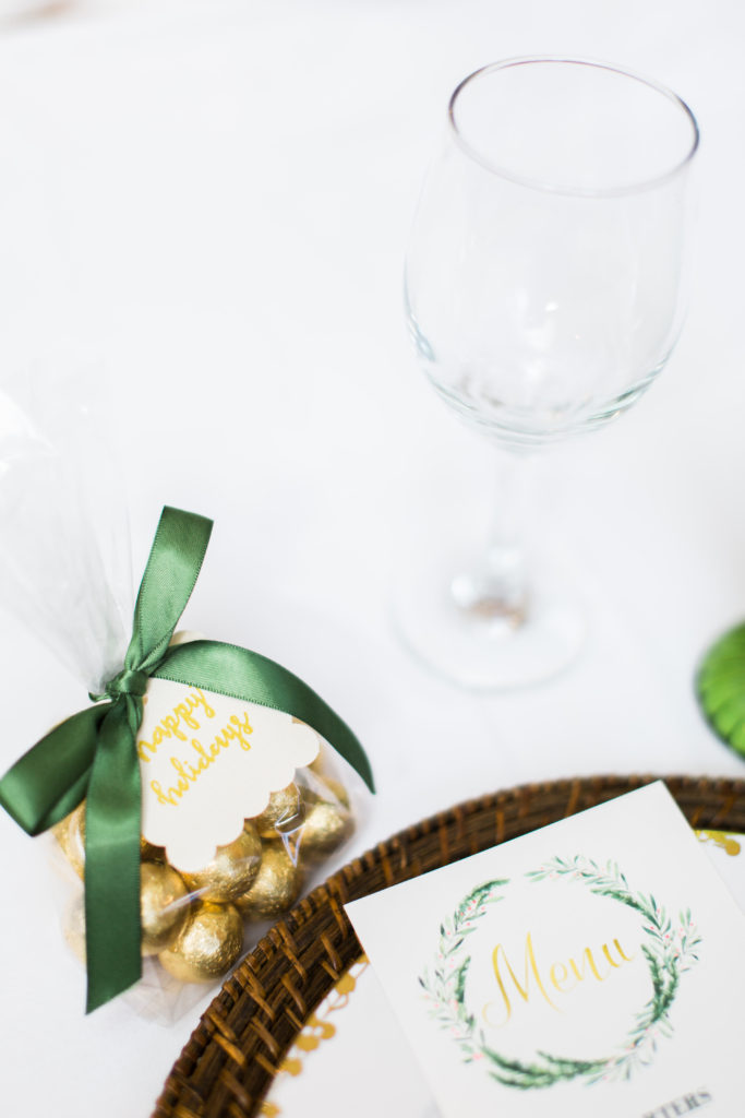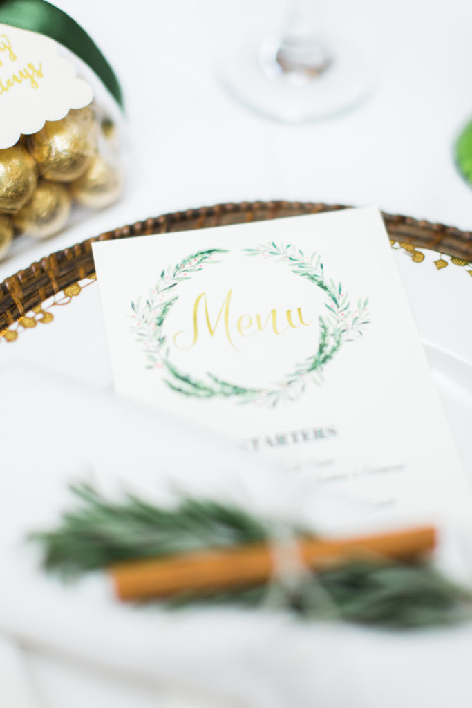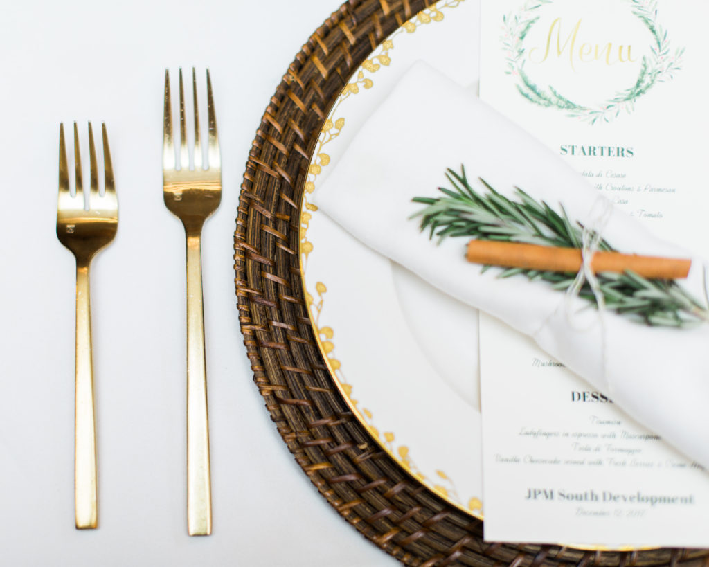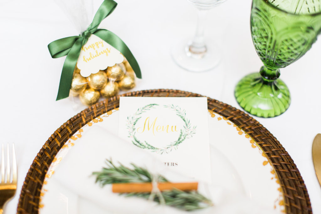 Sometimes we do events other than weddings, and still have just as much fun! A couple weeks ago we designed JPM South’s corporate Christmas party hosted at Mia Francesca in North Hills. Last year we did a red theme with candy canes so this year we decided to go with the other Christmas classic, green. We brought in more natural elements with the charger and fresh rosemary and cinnamon sticks, and accented with touches of gold and a fun green goblet. Lastly, each setting was complete with a bag of chocolate balls filled with caramel for a sweet treat to take home. Thank you to CE Rental for the tableware and SwallowsFlight for the menus! Photography by Foxtail Photography