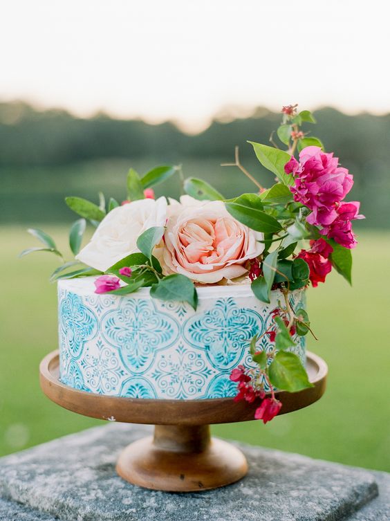 This wedding cake embraces color with it’s tile pattern and beautiful florals.