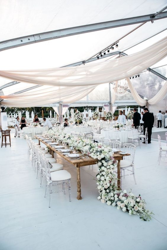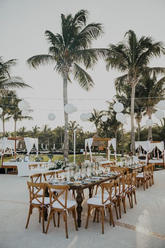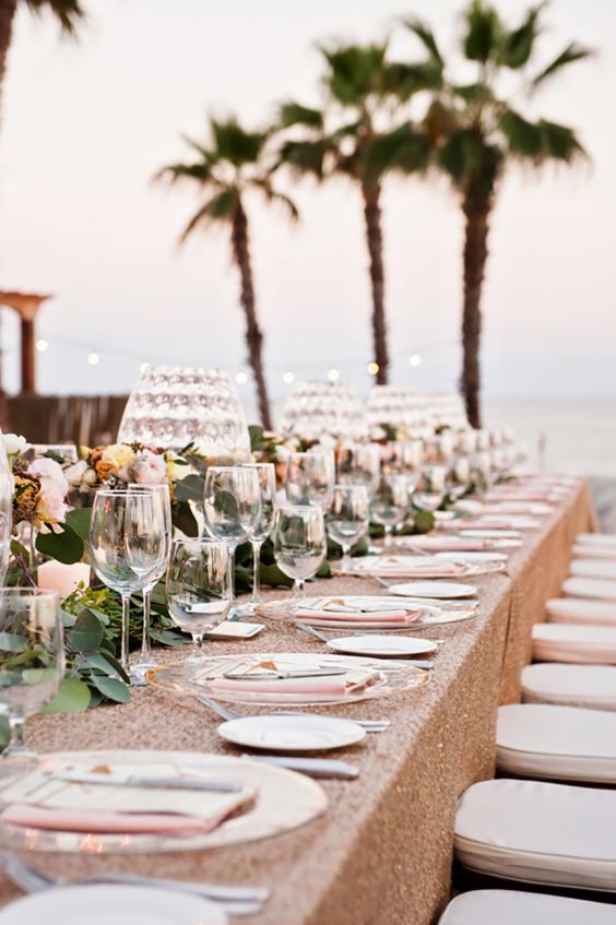 Or, a combo of the two! With glam sequin linens, lush florals, and open air with market lights and palms.