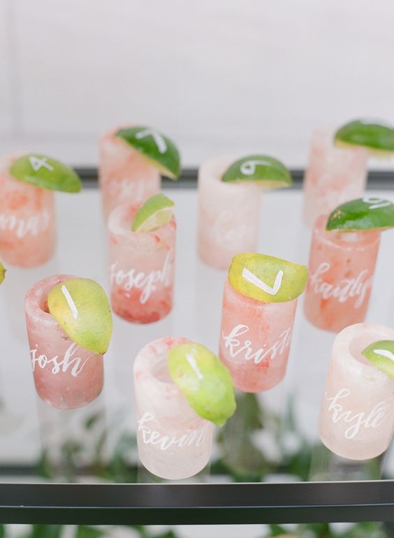 These pink Himalayan salt shot glasses make the perfect tequila shot escort “cards.”